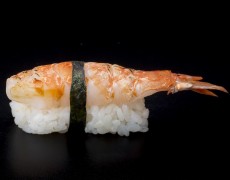 Суши из креветок и острого соуса 5тк, нигири с королевской креветкой, гункан с королевской креветкой и острым соусом